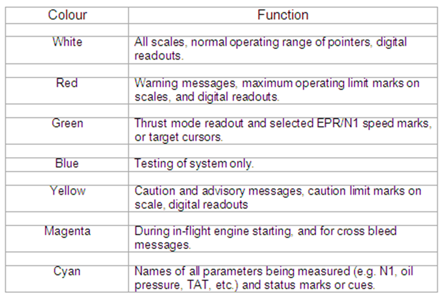 Operating in conjunction with the system are discrete caution and warning lights, standby engine indicators and a remotely-located panel for selecting maintenance data display.  The system provides the flight crew with information on primary engine parameters (Full-time), with secondary engine parameters and advisory/caution/warning alert messages displayed as required. Figure 26 shows layout of the EICAS Displays.