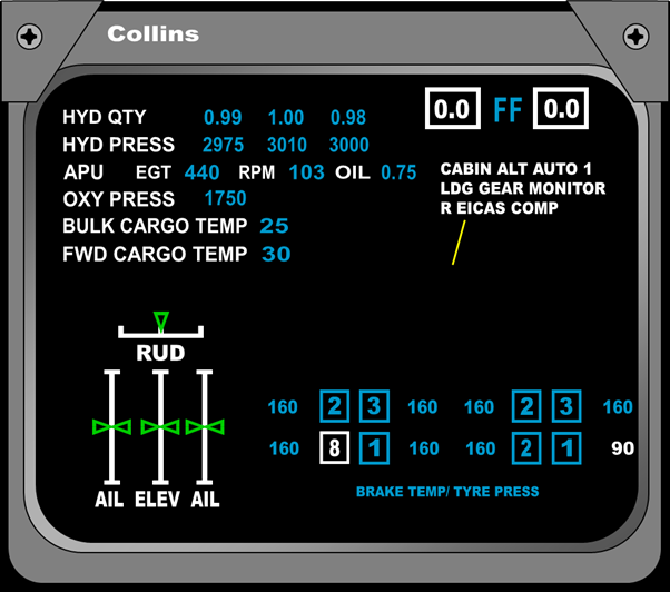When selected this mode displays data to determine the dispatch readiness of an aircraft, and is closely associated with details contained in the aircraft’s Minimum Equipment List.  The display shows the positions of the flight control surfaces in the form of pointers registered against vertical scales, selected sub-system parameters, and equipment status messages on the lower display unit.  Selection is normally done on the ground, either as part of the pre-flight checks of dispatch items, or prior to shutdown of electrical power to aid the flight crew in making entries in the aircraft’s Technical log. Figure 29 shows an example of a status page.