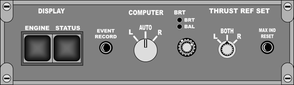 Thrust Reference Set Switch: Pulling and rotating the inner knob positions the reference cursor on the thrust indicator display (either EPR or N1) for the engines, which are selected by the outer knob.