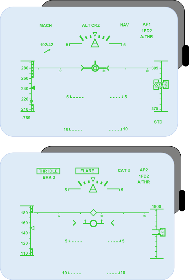 Head-up displays (HUDs) provide pilots with an array of flight-related information, when and where they need it most. The HUD combiner glass, which folds down and locks into position in front of the pilot’s eyes, displays PFD related flight data and symbology directly in the forward field of vision. On a non-precision approach at night or in poor weather, this information is of huge value, particularly when viewed in the context of past aircraft accident investigations. Figure 46 shows an A350 Head-Up Display with the aircraft at altitude and during landing phase.